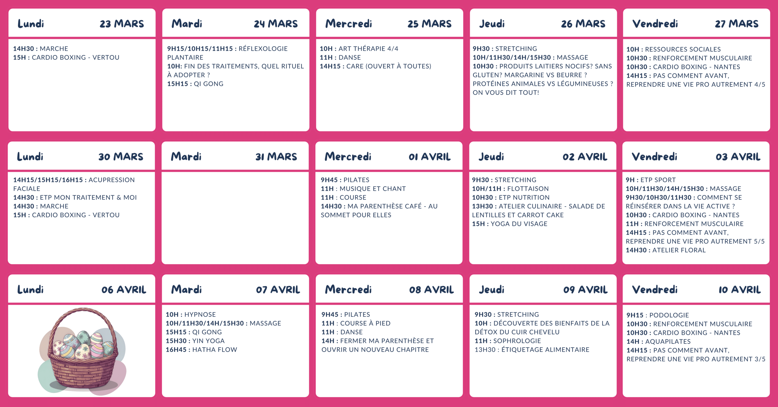 Venez vous défouler, évacuer vos tensions, enfilez vos gants. Sébastien vous propose une initiation à la boxe ! Partantes ? Apporter une tenue de sport (chaussure propre d’intérieur, serviette, bouteille […]