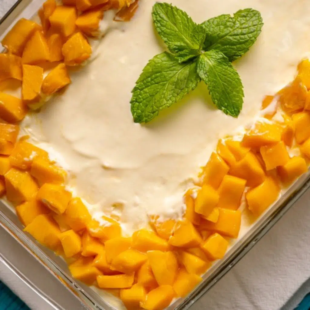 Alternez les couches de biscuits trempés dans le jus d’ananas, la crème et des cubes de mangue sur 2 ou 3 étages selon la taille du plat.